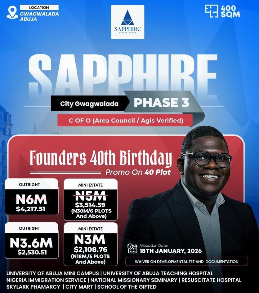 As our Founder Dr. Stephen Akintayo turns 40, enjoy a massive 40% birthday discount when you secure a 400sqm plot at Sapphire City phase 3, Gwagwalada—pay just ₦3,600,000 instead of ₦6,000,000 and save ₦2,400,000, limited to only 40 plots.